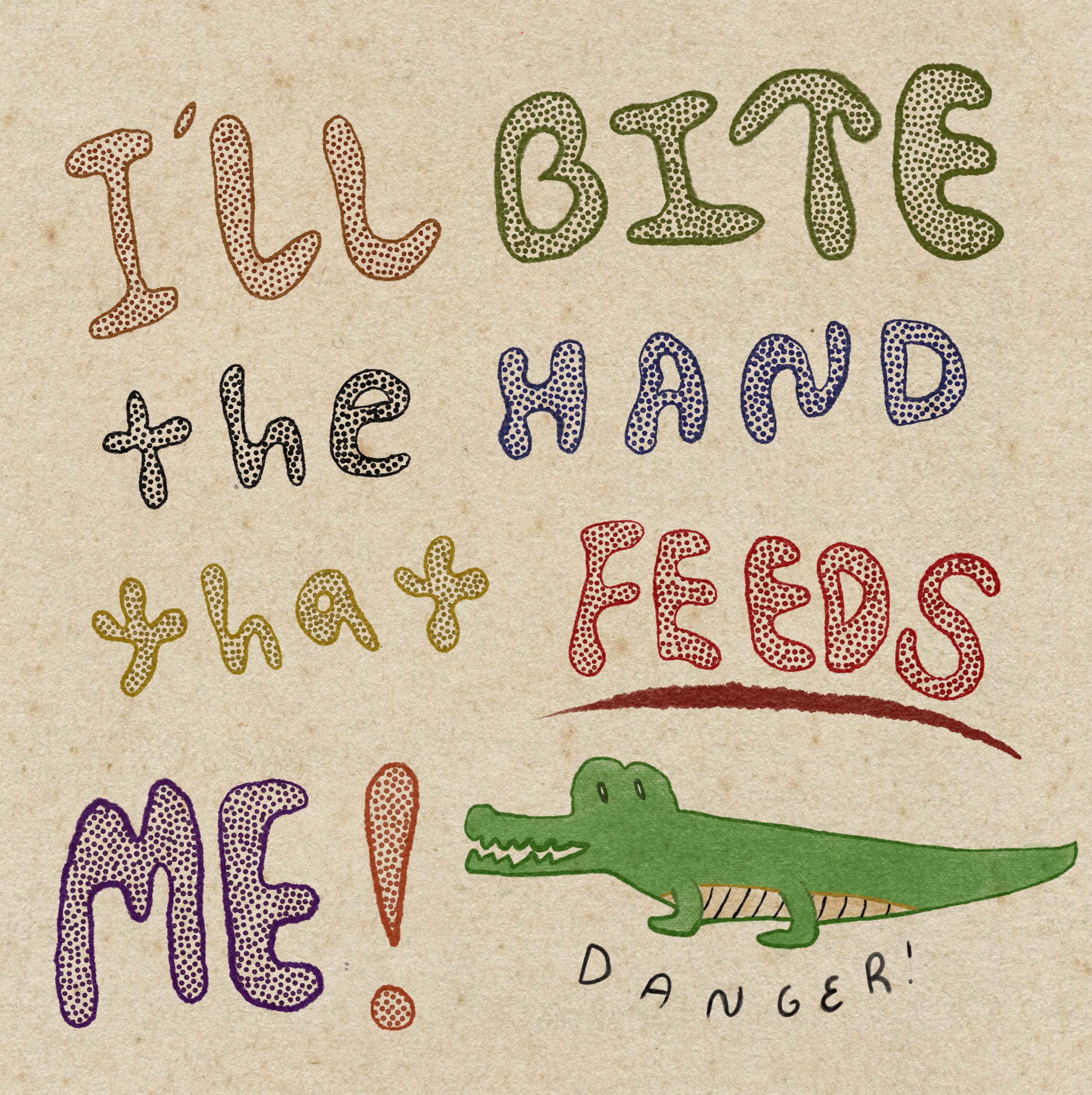 Playful digital illustration on a textured tan background featuring colorful bubble-text that reads “I’ll bite the hand that feeds me!” Each word is stylized in different colors and patterns. Below the text is a cartoon green alligator labeled “DANGE