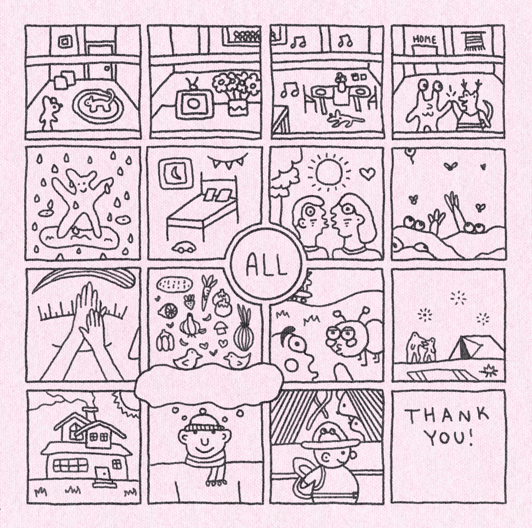 Hand-drawn comic-style animation on a light pink background featuring 20 square panels rotating through an 8-frame loop cycle. Each panel contains black line drawings of different cozy, surreal, or symbolic scenes,  from people sleeping, gardening, e