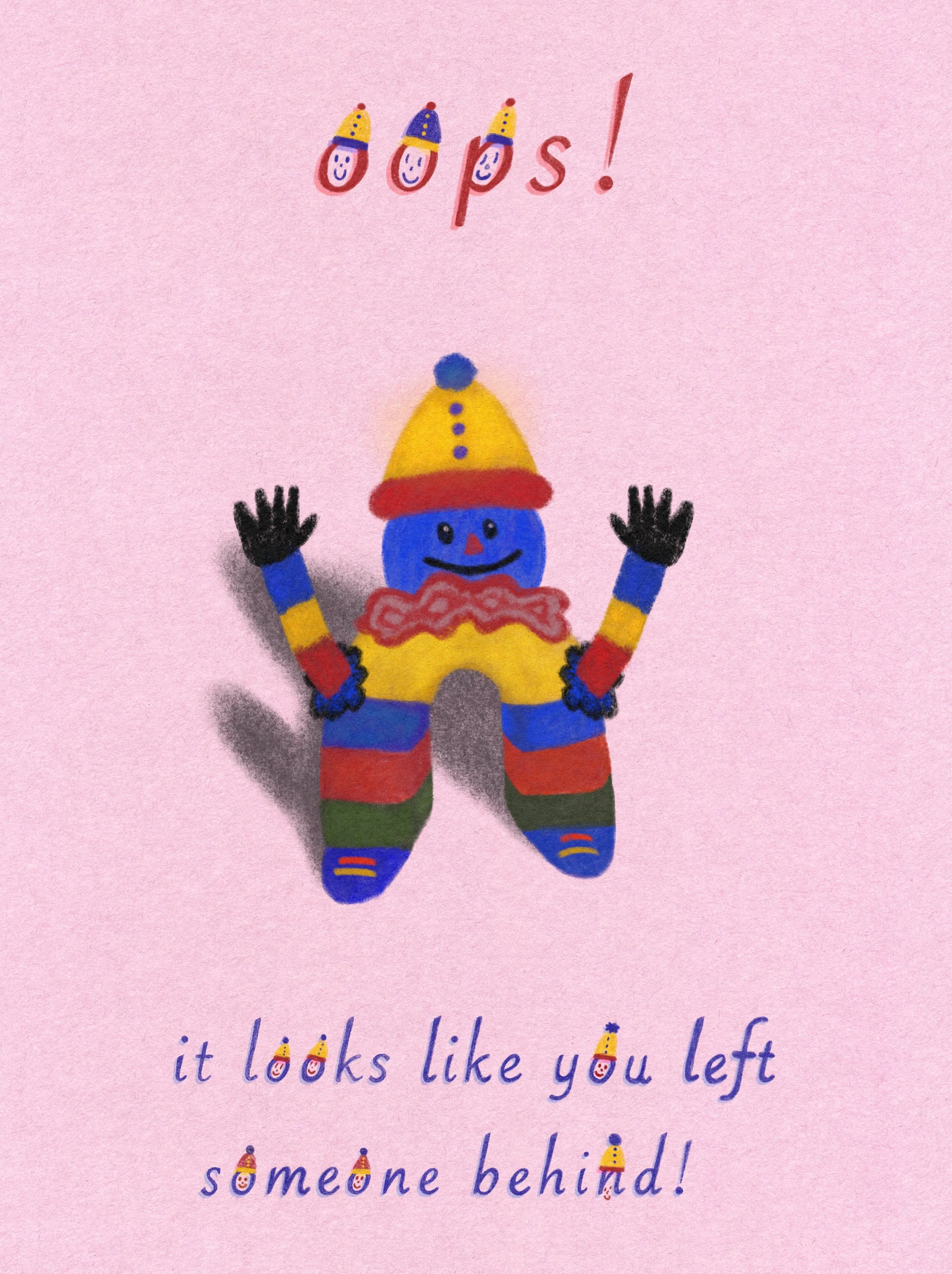 Playful digital illustration on a pink background featuring a colorful clown character with outstretched arms, striped limbs, and a big smile. Above the clown, the word “Oops!” is written in red with little clown faces for the “o”s. Below, it says, “