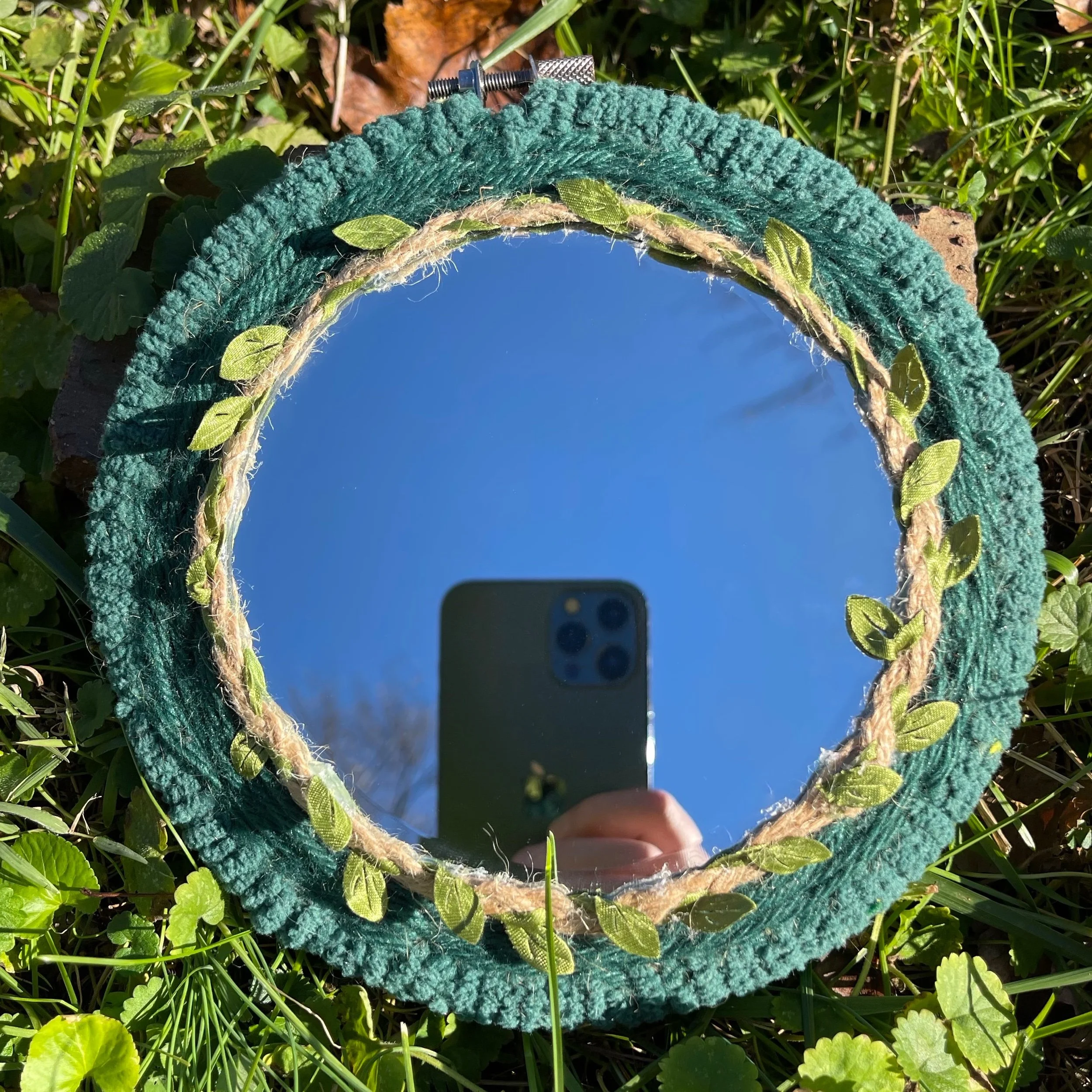 Circular mirror framed with green crochet and a twine border adorned with small artificial leaves. The mirror reflects a bright blue sky and the top half of a smartphone being used to take the photo. The piece is displayed on grass with small green l