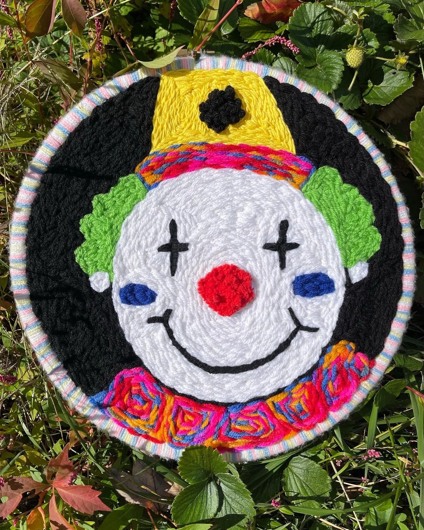 Circular fiber art piece depicting a stylized clown face with a large red nose, green hair, and black X-shaped eyes. The face is embroidered with thick white yarn and detailed with blue cheeks, a black smile, and a colorful collar of swirled pink and