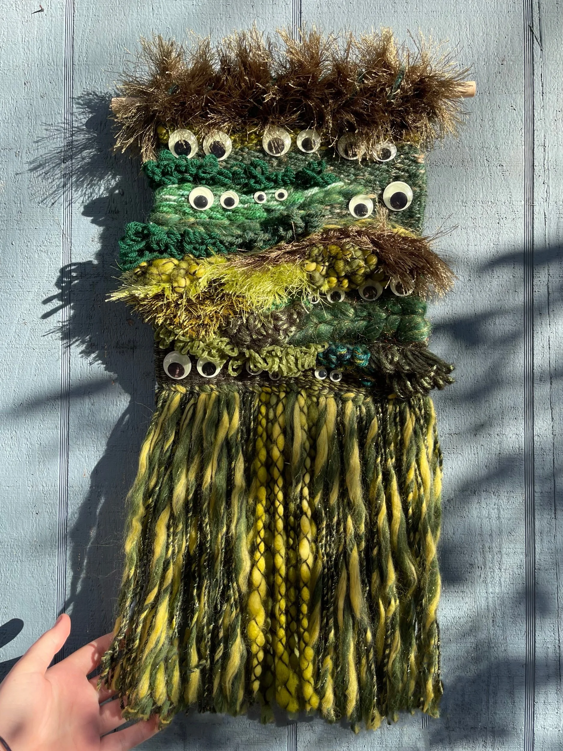 Woven fiber art wall hanging made with layers of green, yellow, and brown yarns in varied textures. Multiple rows include clusters of googly eyes embedded in the weave, giving a playful, creature-like appearance. The bottom half features long, twiste