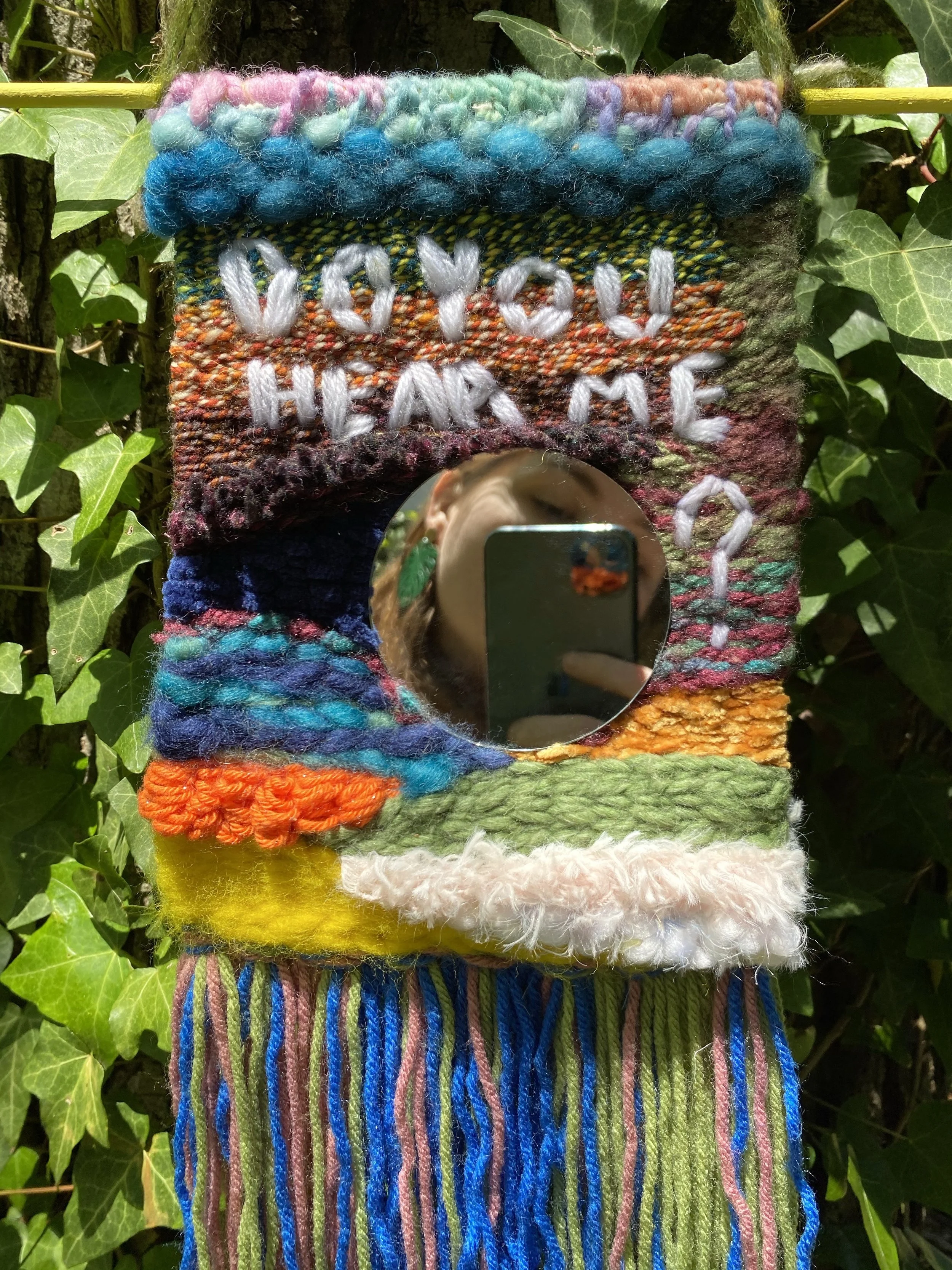 Woven fiber art wall hanging displayed against a tree trunk covered in ivy. The top half features the phrase “DO YOU HEAR ME?” stitched in white yarn on a multicolored woven background. A circular mirror is embedded in the center, reflecting part of