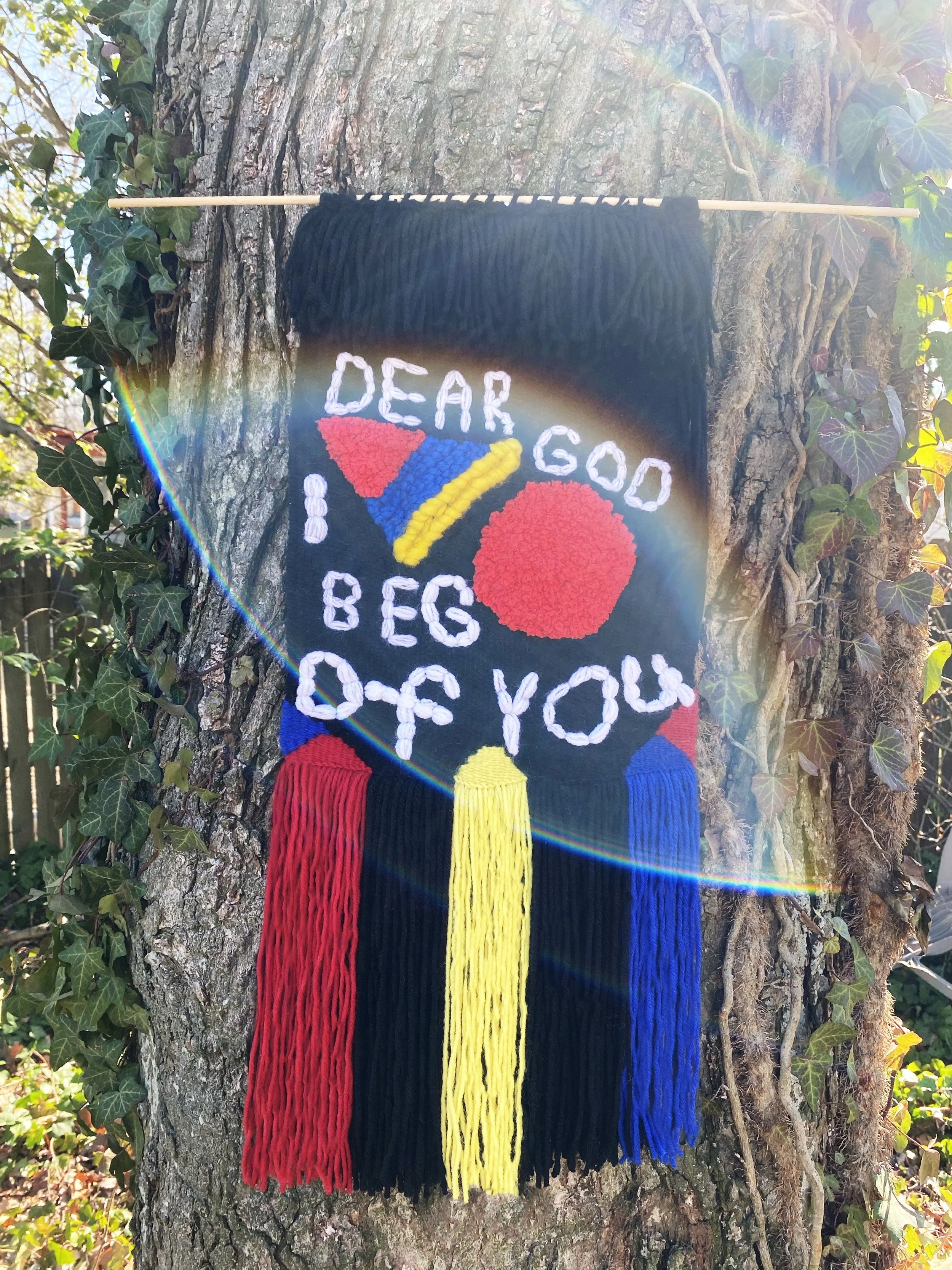 Rectangular woven wall hanging mounted on a wooden dowel and displayed against a tree trunk. The black fiber background is embroidered with white letters that read: “DEAR GOD I BEG OF YOU.” Colorful yarn shapes in red, blue, and yellow appear above t