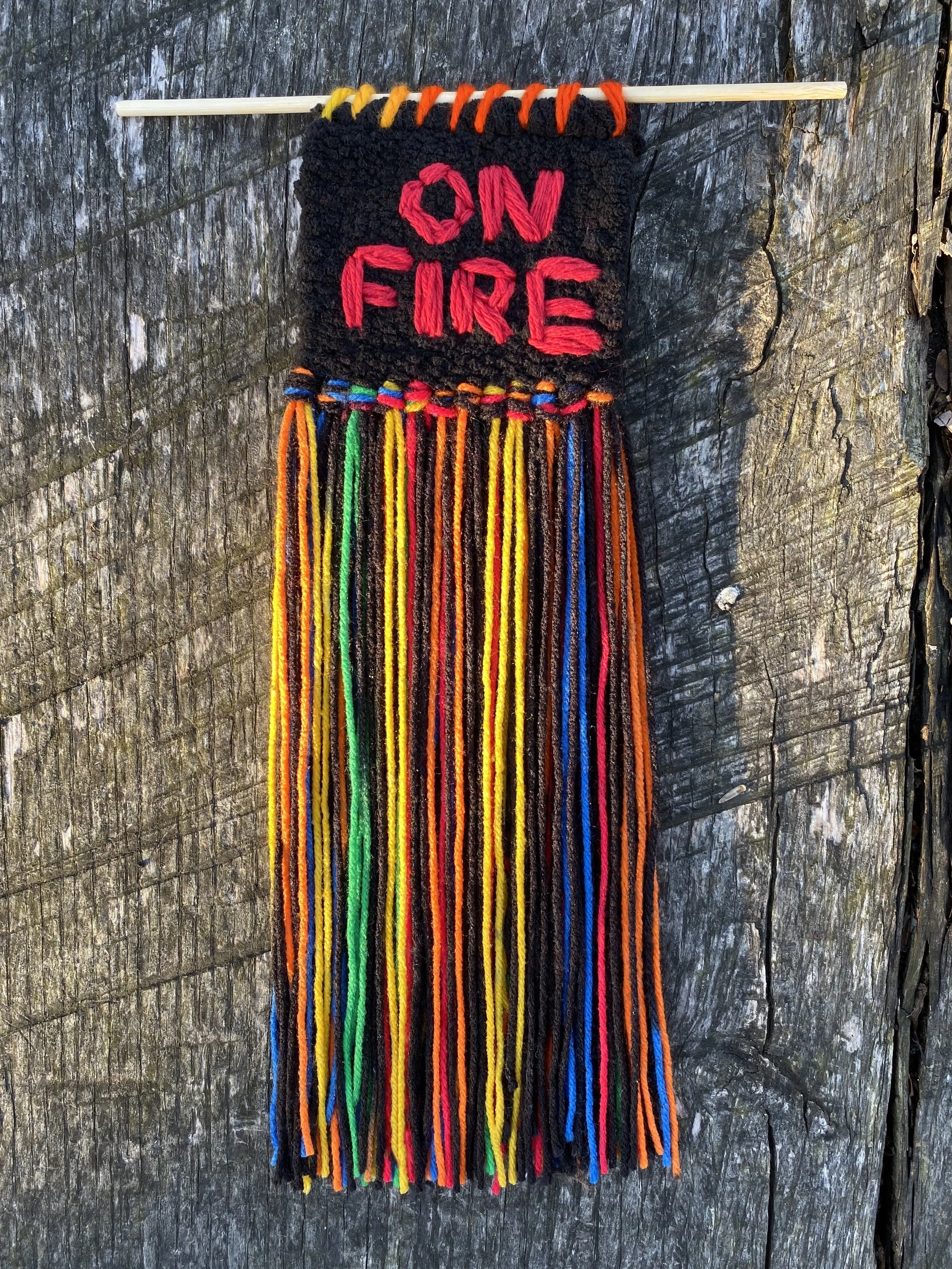 Fiber art wall hanging featuring the words “ON FIRE” embroidered in bright red yarn on a black woven background. Colorful vertical yarn strands in orange, yellow, green, red, blue, and pink hang from the lower edge. The piece is suspended on a wooden