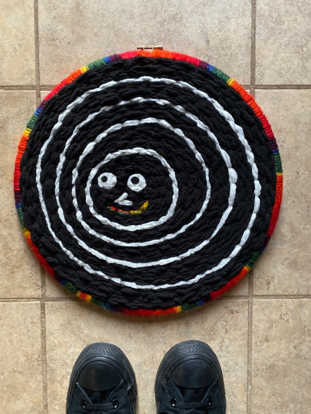 Circular fiber art wall hanging featuring a black background with concentric white spiral lines. At the center is a simple smiling face with white eyes and a yellow-and-red stitched mouth. The outer edge is bordered in multicolored yarn. The wall han