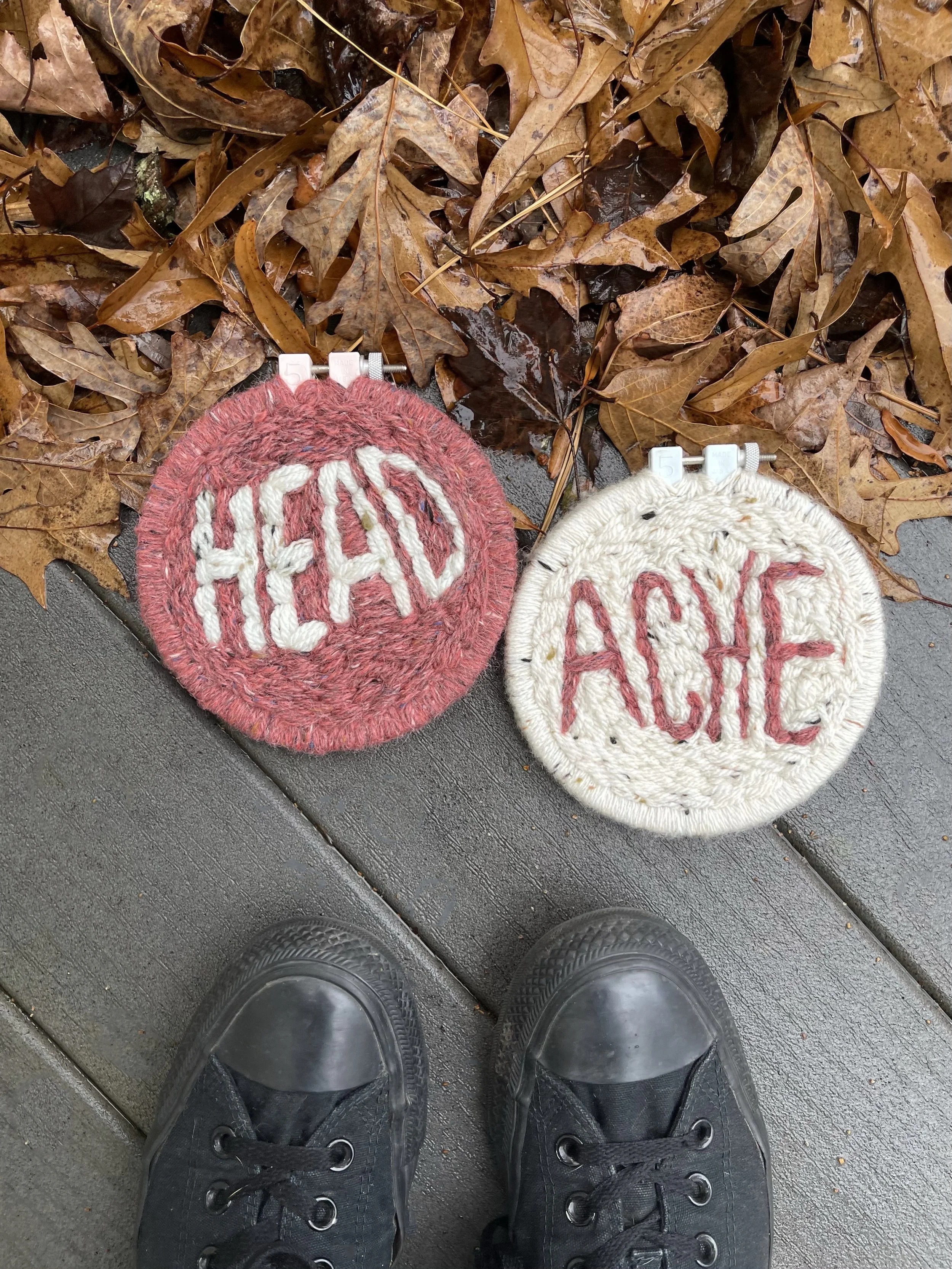 Two circular fiber art pieces in embroidery hoops, placed side by side on a wooden deck with autumn leaves scattered above them. The left piece is made with red yarn and stitched with the word “HEAD” in white. The right piece uses a cream-colored yar