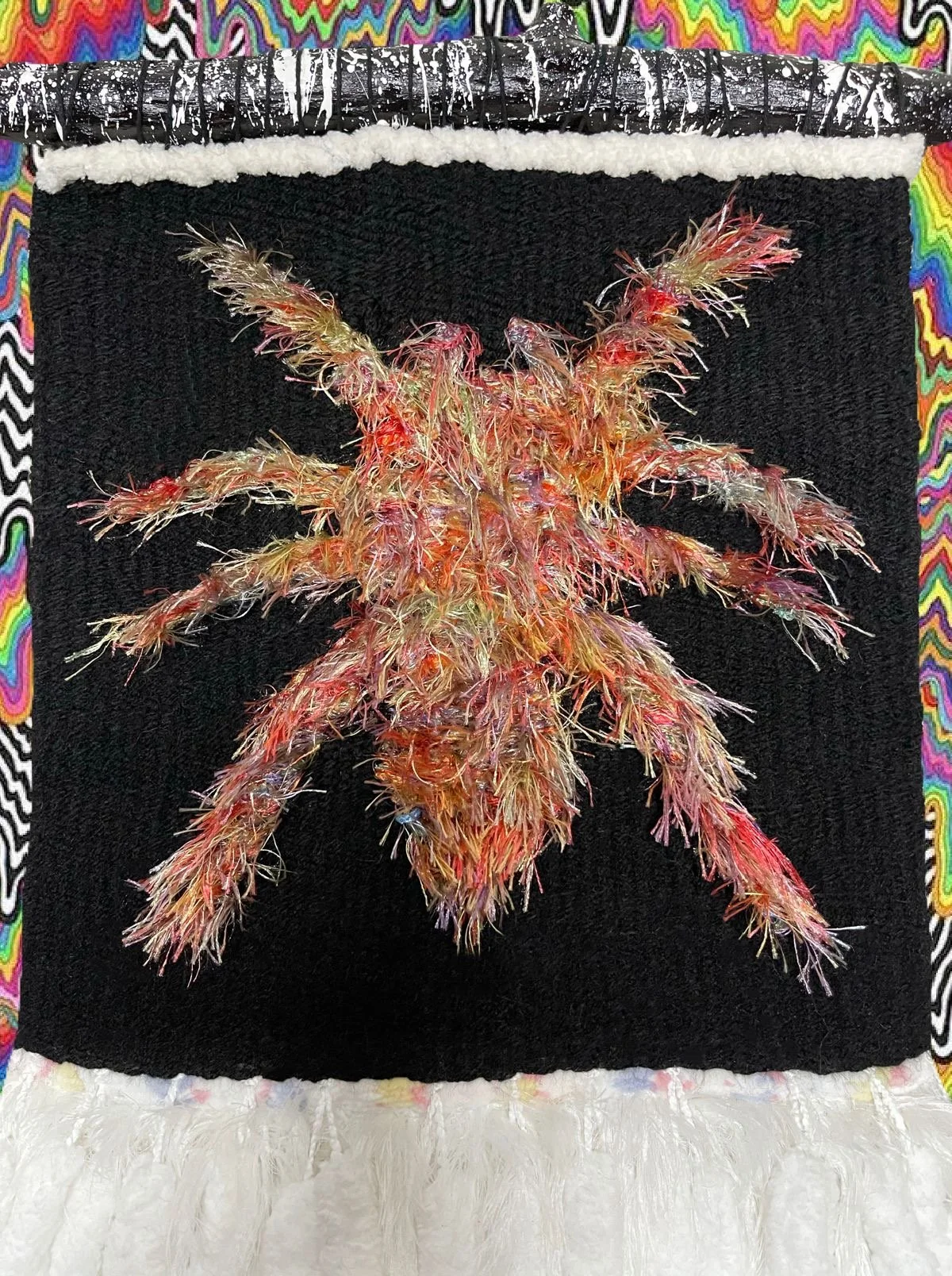 Fiber art tapestry featuring a large, textured spider woven with multicolored yarn on a solid black background. The spider’s legs and body are made with frayed, iridescent fibers in shades of red, orange, and pink. The background of the photo feature