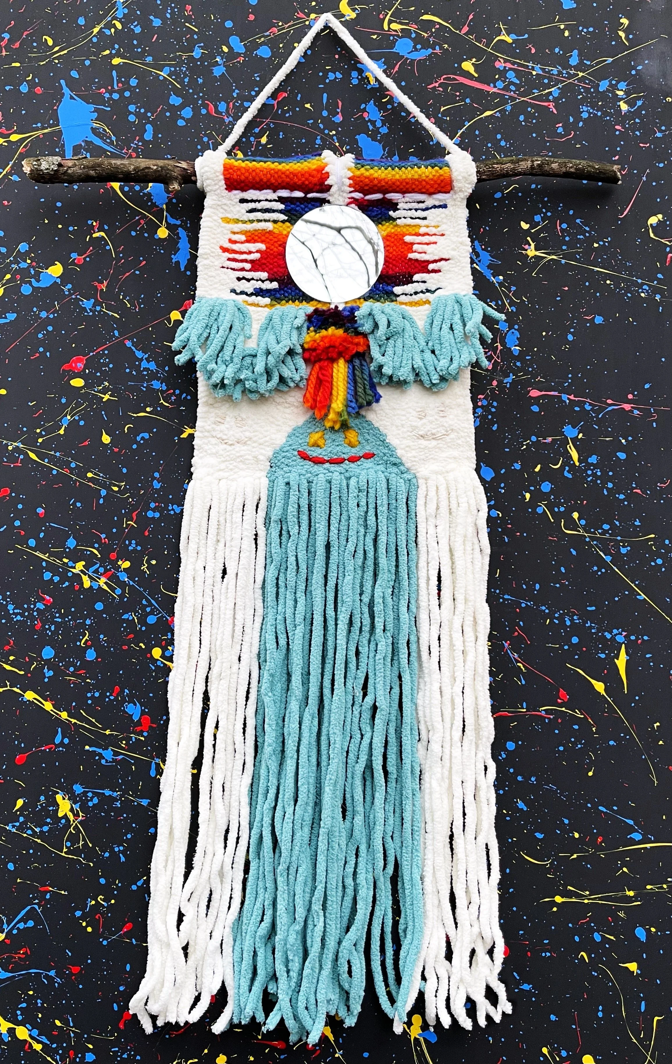 Large woven fiber art piece mounted on a stick, displayed against a black backdrop with colorful paint splatters. The upper section includes a round embedded mirror and abstract patterns in red, orange, white, and blue yarns. Below the mirror, thick