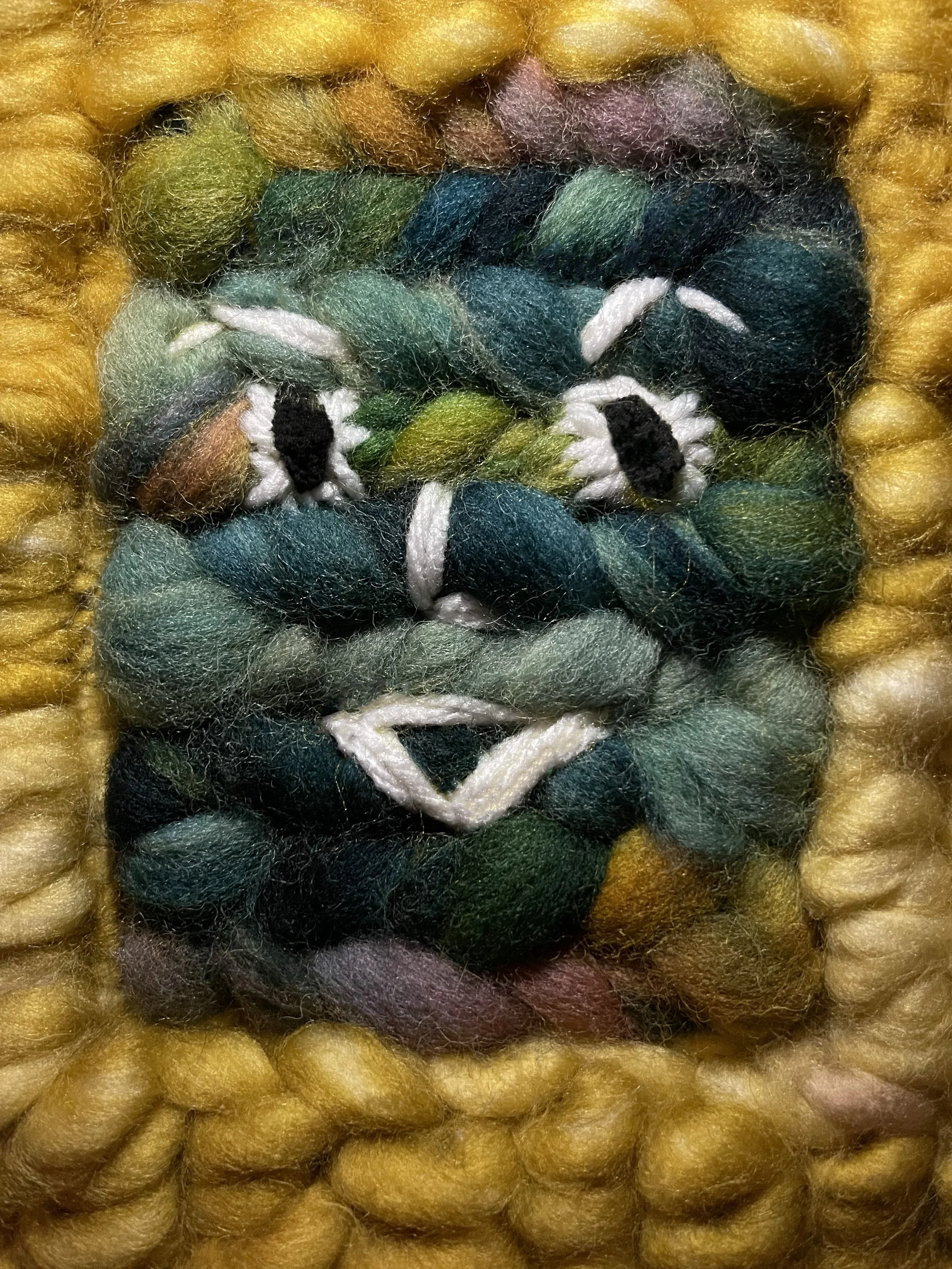 Close-up of a woven fiber art face framed in thick yellow wool roving. The face is made from tightly packed green, teal, and multicolored yarns, with white stitched eyebrows, black and white eyes, and a triangular white mouth. The expression appears